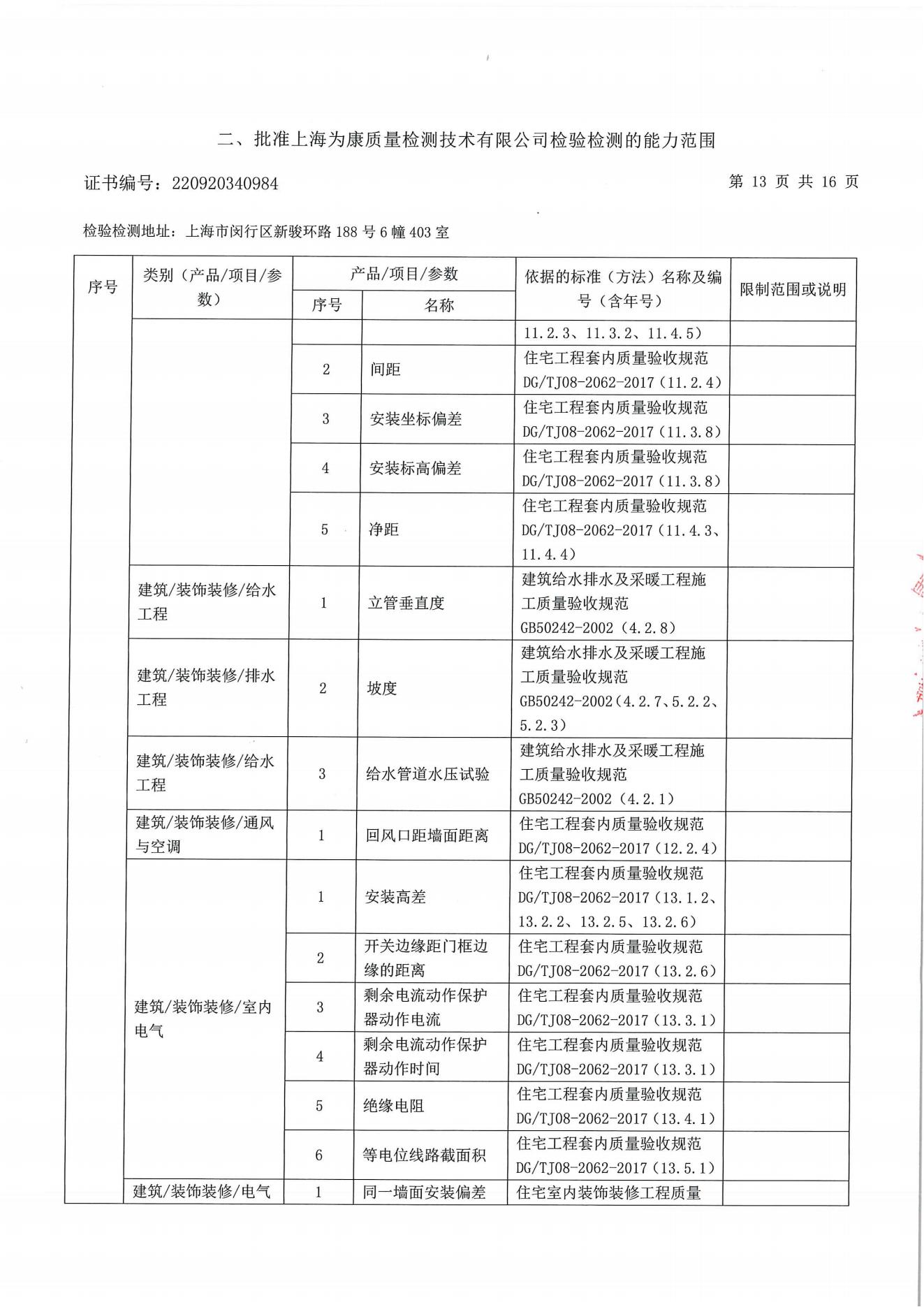 分戶驗收要求 分戶驗收:即交房前依照相關標準對區域內住宅逐套進行驗收。自2009年10月1日起所有上海市住宅工程強制實施分戶驗收?!渡虾J泄こ藤|量分戶驗收管理規定》住宅工程竣工驗收前必須依照《住宅工程套內質量驗收規范》DG/TJ08-2062-2009和現行工程質量標準、規范,對每戶套內的觀感質量、使用功能及使用安全進行驗收。凡未實施分戶驗收的,該工程項目將不得交付使用;服務范圍 一、裝修房全過程跟蹤檢查:從毛坯到裝修結束全過程跟蹤檢驗;對隱蔽工程施工進行檢測;對裝飾 材料進行控制;每個施工節點作好原始記錄并提出整改意見;待整改結束進行復查,直至符合 要求;最終每戶出具一份檢測報告。 二、裝修房竣工驗收:主要對安全、使用功能及表面觀感質量進行檢測;每個施工節點作好原始記錄并提出整改意見;待整改結束進行復查,直至符合要求;最終每戶出具一份檢測報告。 三、毛坯竣工驗收:主要對安全、使用功能及表面觀感質量進行檢測;每個施工節點作好原始記錄并提出整改意見;待整改結束進行復查,直至符合要求;最終每戶出具一份檢測報告。 四、個人交房驗房檢測。 建設工程分戶驗收檢測參考標準 DG/TJ08-2062-2017 《住宅工程套內質量驗收規范 》 DB/T 31/30-2003《住宅裝飾裝修驗收標準》 GB50209-2002《建筑地面工程施工質量驗收規范》 GB50210-2001《建筑裝飾裝修工程質量驗收規范》 GB20242-2002《建筑給排水及采暖工程施工質量驗收規范》 GB50300-2001《建筑工程施工質量驗收統一標準》 GB50303-2002《建筑電氣工程施工質量驗收規范》 套內質量檢測(一房一驗)內容 檢測內容 建筑尺寸 室內地面:水泥砂漿地面、木、竹地板,板塊地面 室內頂棚:頂棚抹灰、吊頂工程 室內墻面:墻面抹灰、飾面板(磚)墻面、涂飾工程、裱糊工程、軟包工程 建筑門窗 樓梯與護欄 細部工程:櫥、柜,窗簾盒、窗臺板、門窗套、可折裝式隔斷、淋浴房 給排水與燃氣:室內給水、室內排水、衛生器具、燃氣管道 通風與空調:送排風和防排煙、空調工程、 室內電氣:燈具安裝、開關、插座,分戶配電箱、室內配線、等電位聯結 弱電工程:有線電視安裝工程、電話、信息網絡安裝工程,訪客對講安裝工程、安防報警系統 太陽能熱水系統 室內環境評價